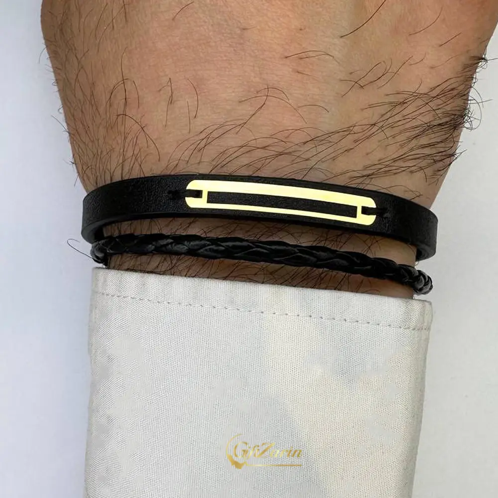 دستبند چرم و طلا مردانه با پلاک اسم